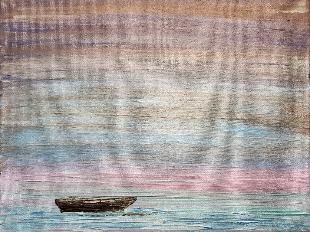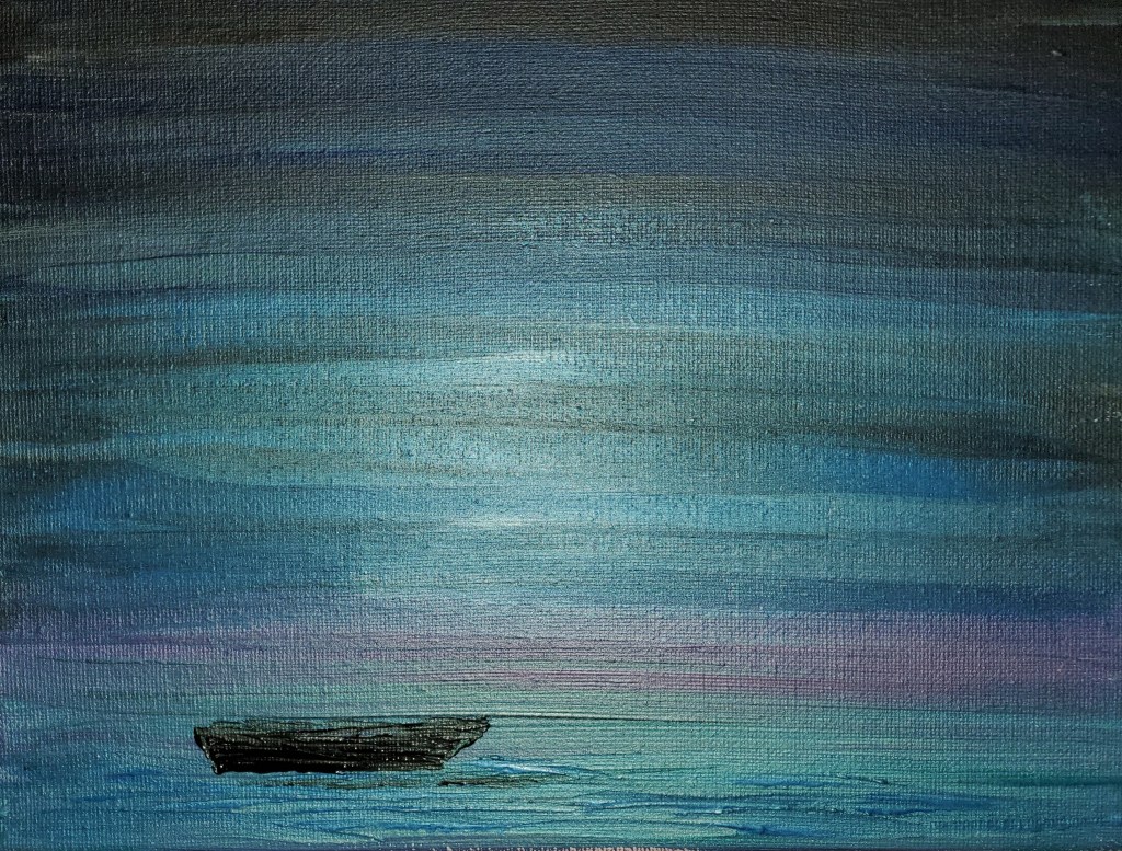 I started two other canvases that day, but finished neither of those. I’m okay with it. The luxury of having dedicated space for creative work allows me to slow things down and really take some time. So much so that I’ve been re-exploring watercolor recently (the miniatures I did in September were in watercolor), and this next piece, which I painted this week (Monday?), was an opportunity to give new gouache paints a try. “Ship of Dreams” is another 8″ x 10″ piece, and is inspired by contemplation of dreams and dreaming.