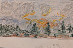 A study in pastel pencil for later work in soft pastels. “Summer Sunrise”, 5″ x 7″ 2024 [sold]