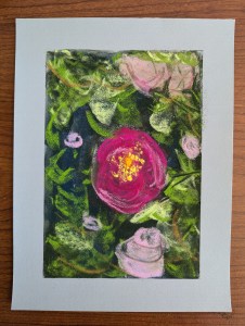 “Summer Dahlias” 5″ x 7″ pastel on pastel board, 2024