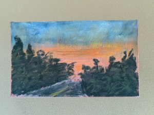 Reflecting on the recent drive to the coast on my last painting getaway, I worked from the recollection of the drive, similar other sunset drives, and the view of a sunset in-progress from the balcony of my hotel room. It was a fun quick piece that I did while the sunset flared to full vividness, and finished as it faded.