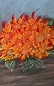 A pot of autumn chrysanthemums on a table inspired this piece. I enjoy using the bright hues of yellow, orange, and red pastels. There’s something fun and freeing about painting flowers, and an innocence and simplicity the riot of bright colors. Flowers seem somehow undemanding and joyful, and of all the pieces I’ve recently painted, my eyes keep coming back to this one.