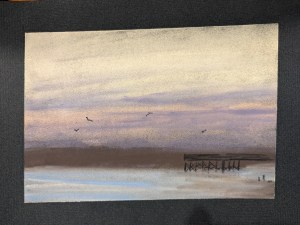 This piece is painted entirely with Blue Earth pastels, and on Clairefontaine Pastelmat, taking advantage of a new tabletop easel. It’s been awhile since I worked from an easel, and in pastel there are some definite advantages, one being that loose pastel dust falls away from the work immediately, reducing the risk of smudging it into the work in spots where it doesn’t belong.